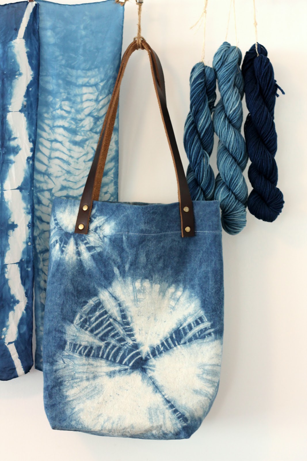 Robin, who calls herself one of the Co-Ringleaders showed me around during drop-in crafting time (which is free) and chatted while she worked on some knitting along with her own small business venture, MiMBY (short for Made in My Back Yard). The bags are made from fabric that she often dyes or block prints herself, along with full grain leather straps made from our own scrap leather. She offers classes, teaching people how to make these bags, and also offers them for sale on her Etsy site.
