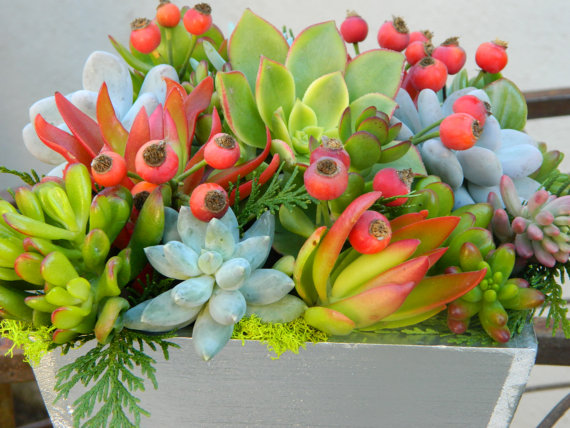 Holiday succulent centerpiece by The Little Succulent Shoppe. Wouldn't this be a great gift to send ahead of time to a sister who can't be with you for the holiday? ($25)