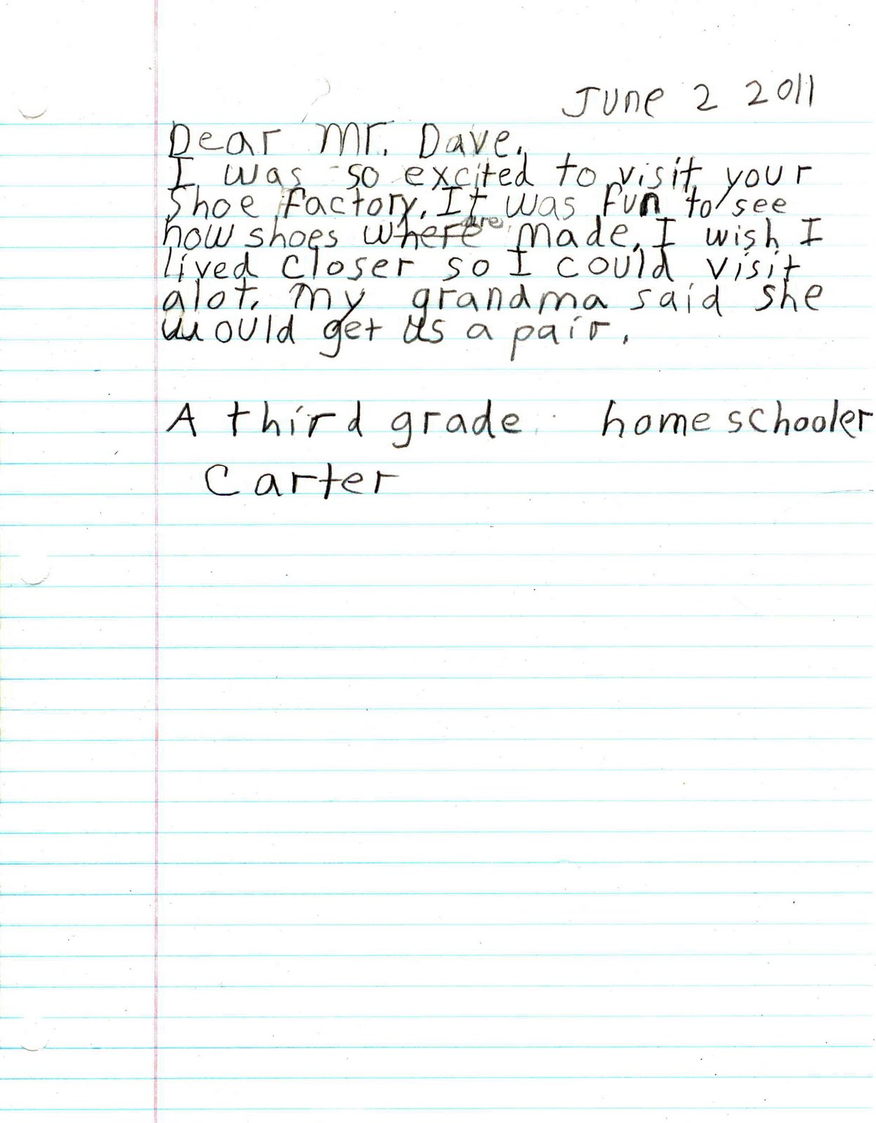 Dave gave a tour of our factory to a couple of 3rd grade homeschooled boys last week. They came with their aunt and their grandmother. As Dave says, it isn’t easy to make the time for tours, but they are always fun to give. Our friend, Katie, took the above photo in the women’s room at the Fargo (love the idea of a chalk board in the bathroom, by the way), and the other two photos are sweet thank you letters from the boys.