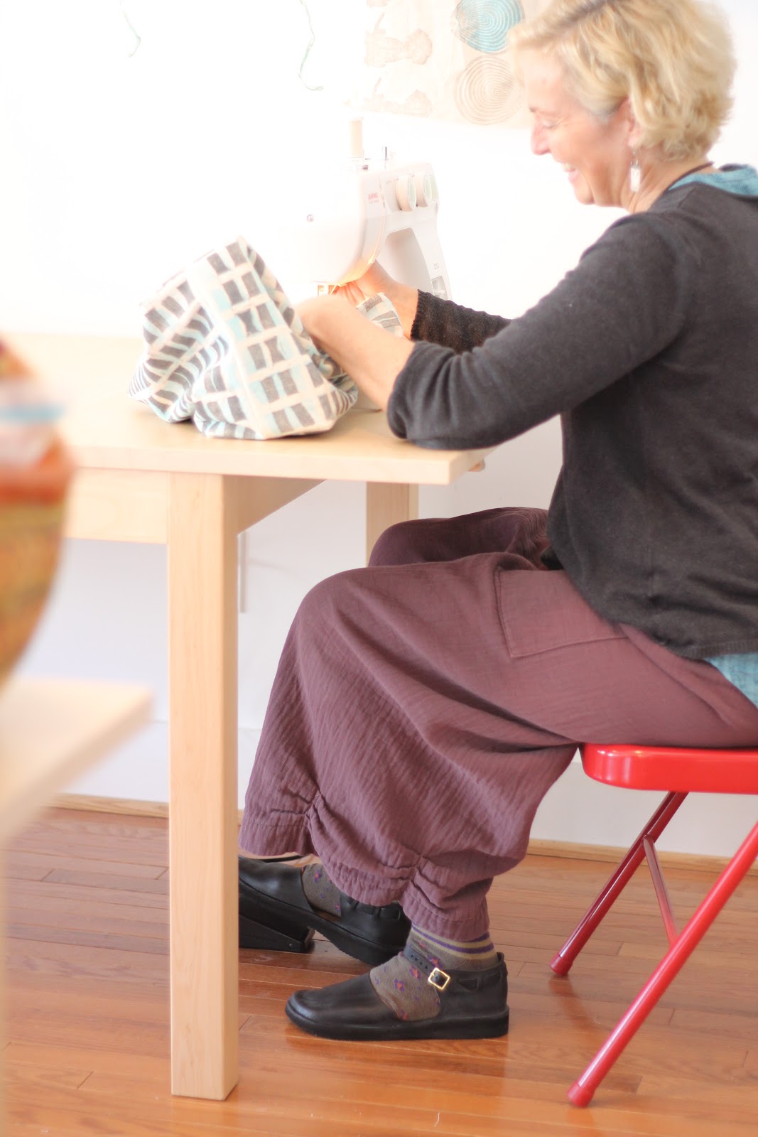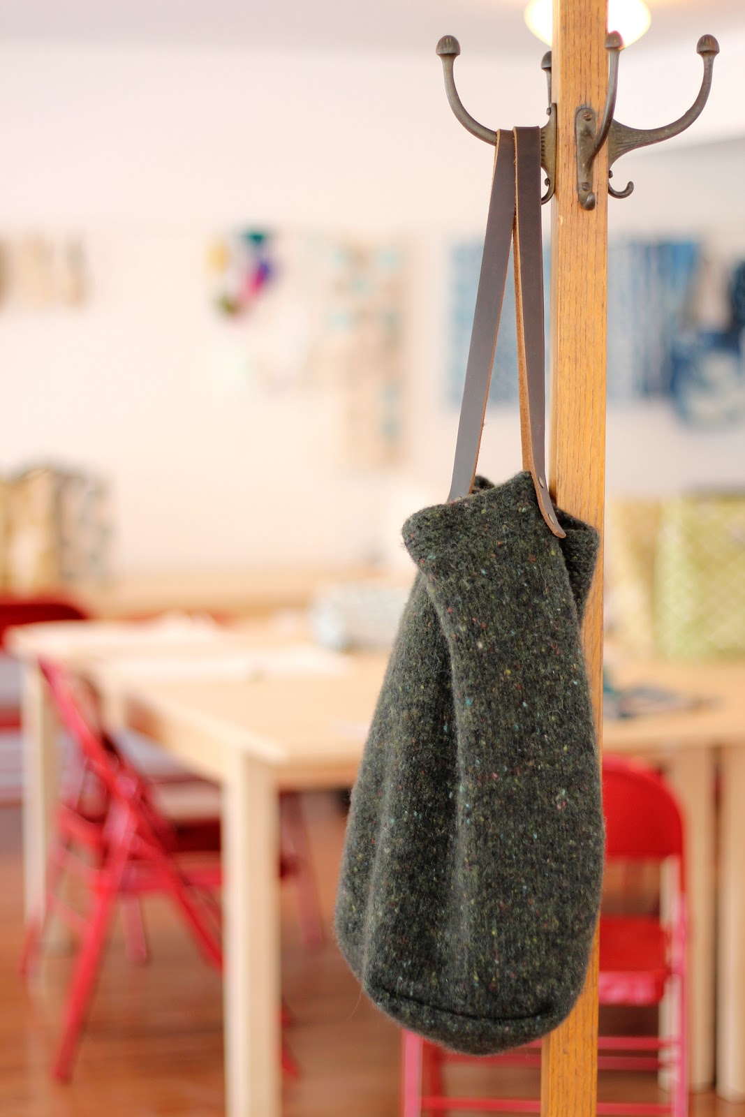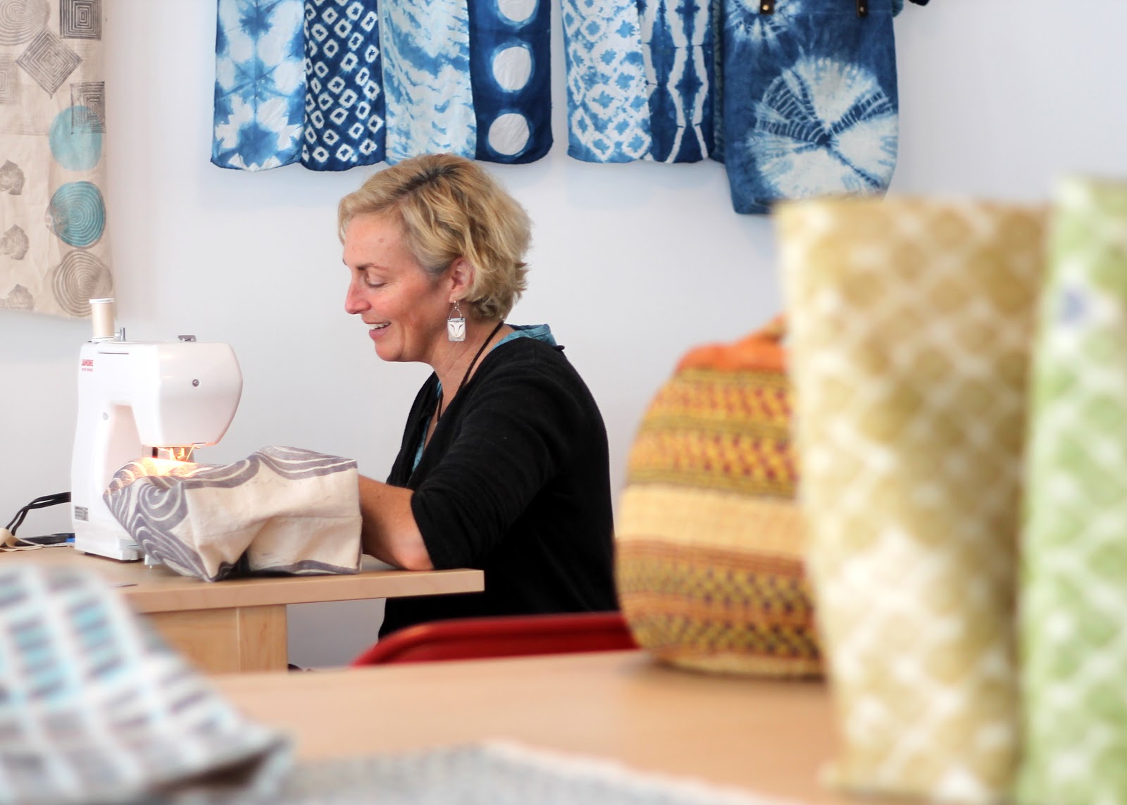 罗宾(Robin)自称为共同头目之一,她在手工制作时间(免费)期间带我四处参观,并一边与她自己的小型企业 MiMBY(Made in My Back Yard 的缩写)一起编织,一边聊天。 )。这些包袋是由她经常自己染色或版画的布料制成的,还有由我们自己的废皮革制成的全粒面皮带。她开设课程,教人们如何制作这些包,并在她的Etsy 网站上出售这些包。